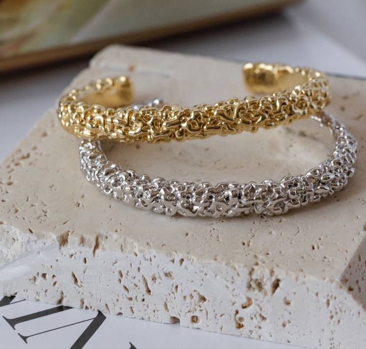 Bracelete desenvolvido em eletroformação, uma técnica italiana na qual sua joia fica oca, trazendo leveza ao usar.