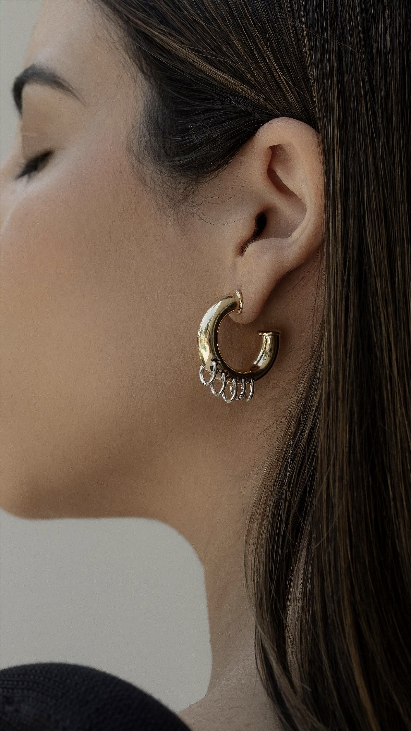 Brinco argola tubo em ouro com argolinhas em ródio branco.