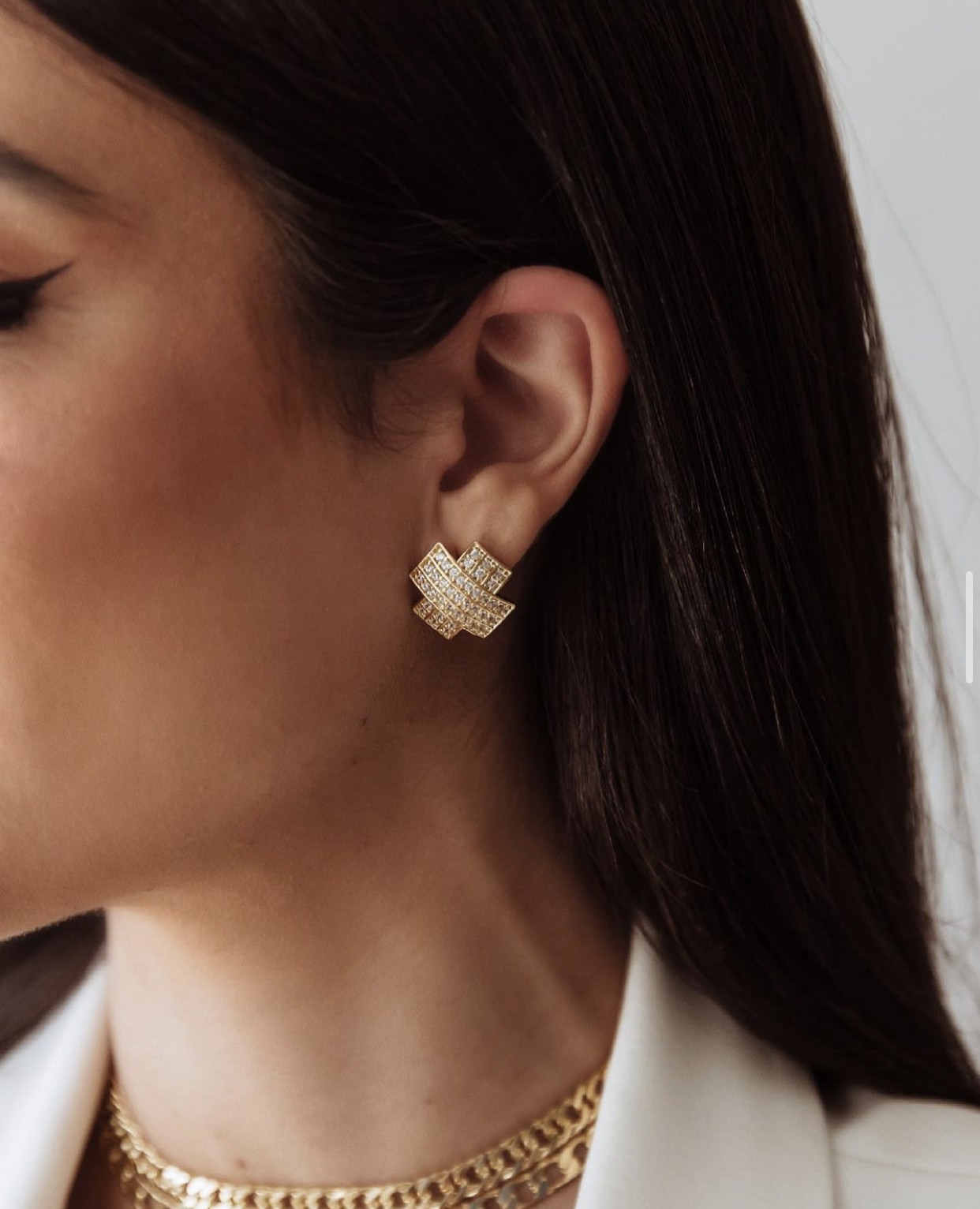 Brinco estilo botão em formato X todo cravejado em micro zircônias