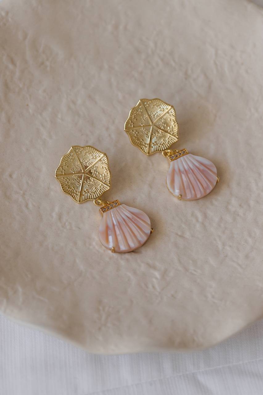 Brinco com base imitando uma bolacha do mar, com madrepérola rainha em forma de concha e detalhes em micro zircônias.