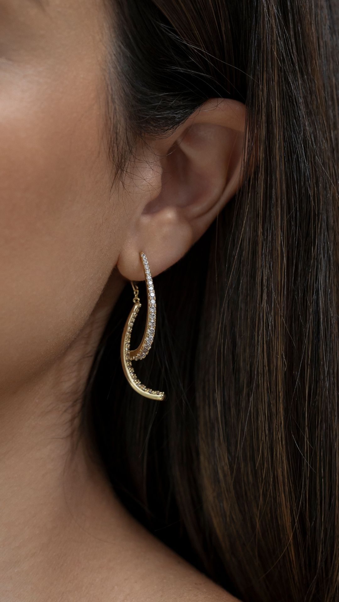 Brinco cravejado com curva dupla, sendo uma por trás da orelha, fixa na tarraxa.