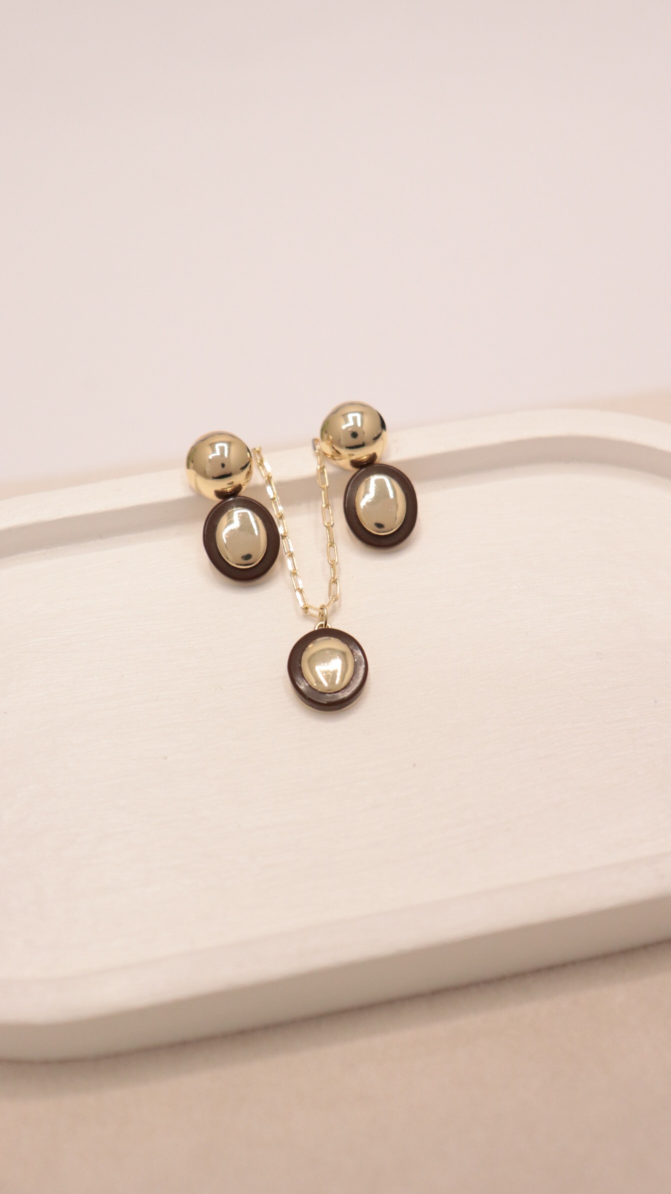 Brinco com base de esfera lisa e pingente oval com borda marrom.