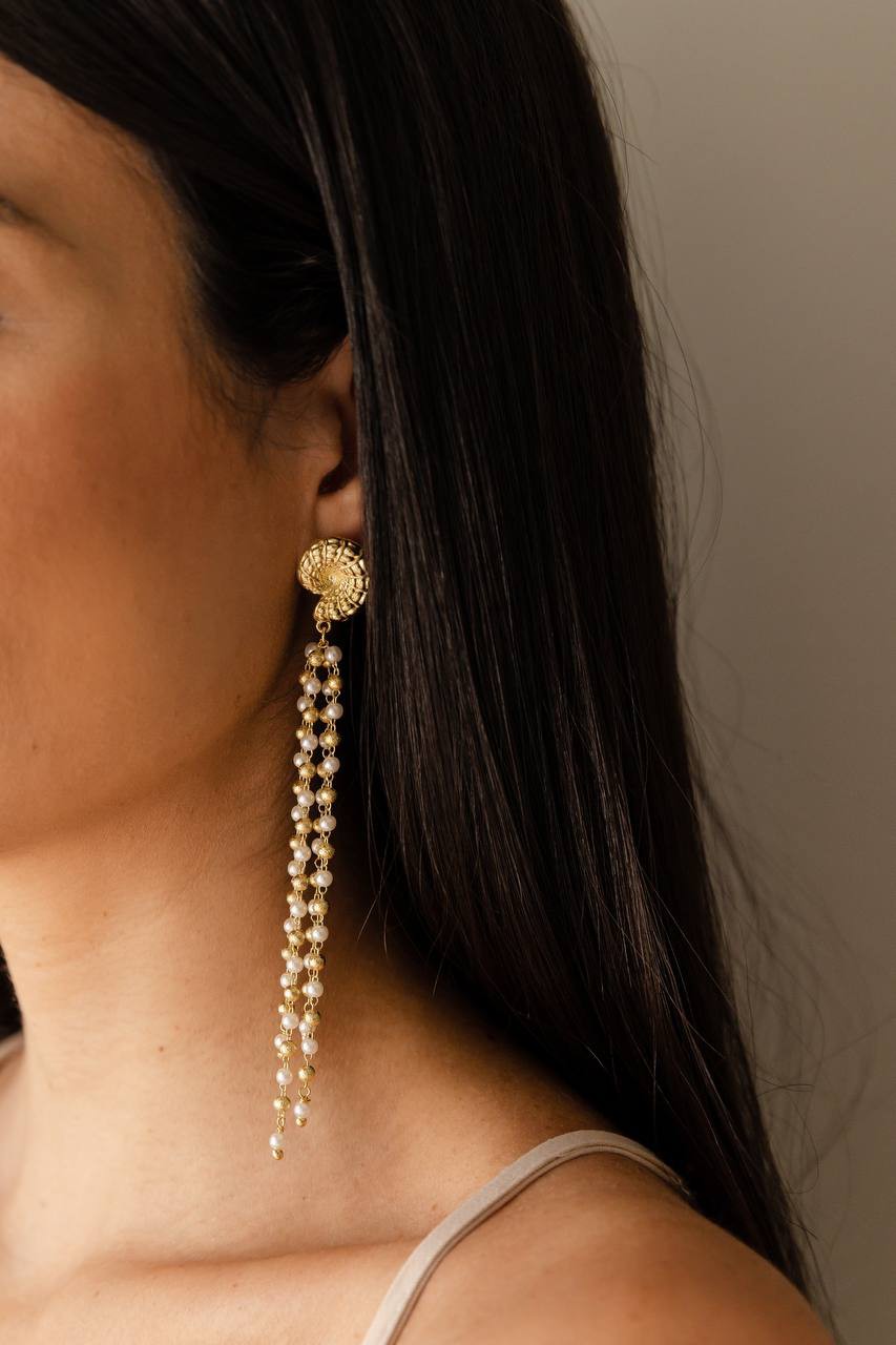 Brinco longo de concha com franja e pérolas