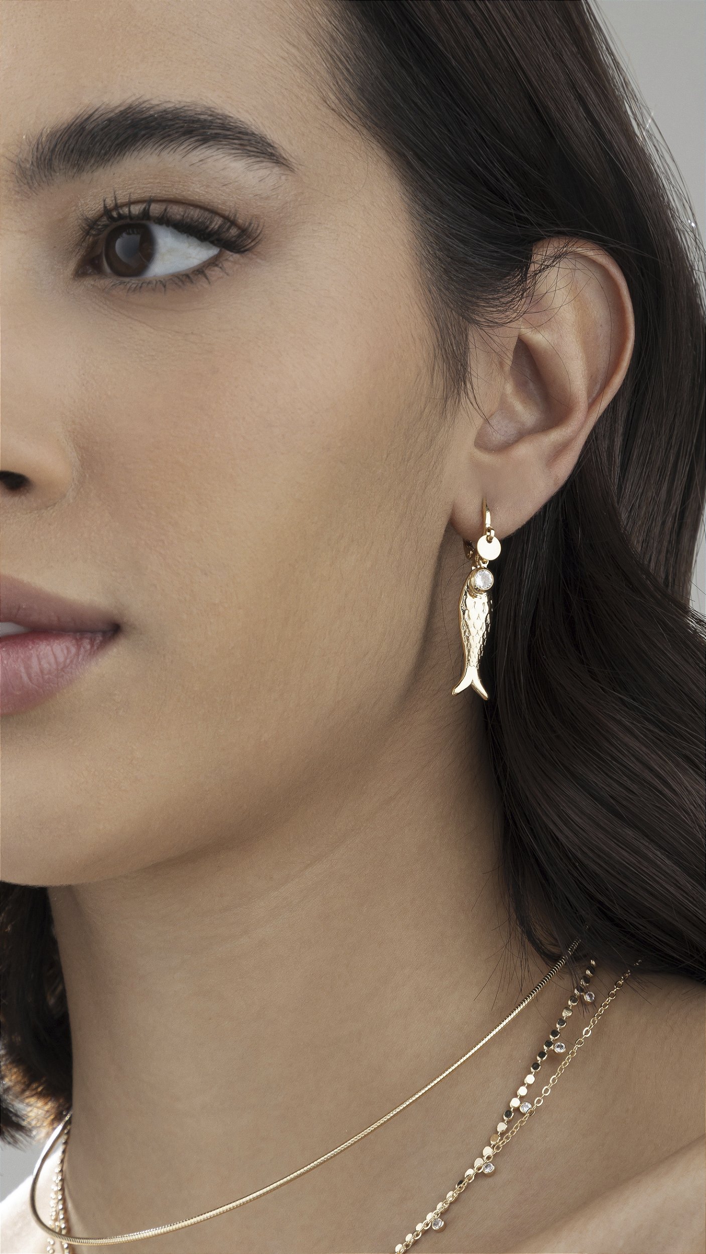Brinco de click com pingentes de esfera, ponto de luz e peixe/sardinha.