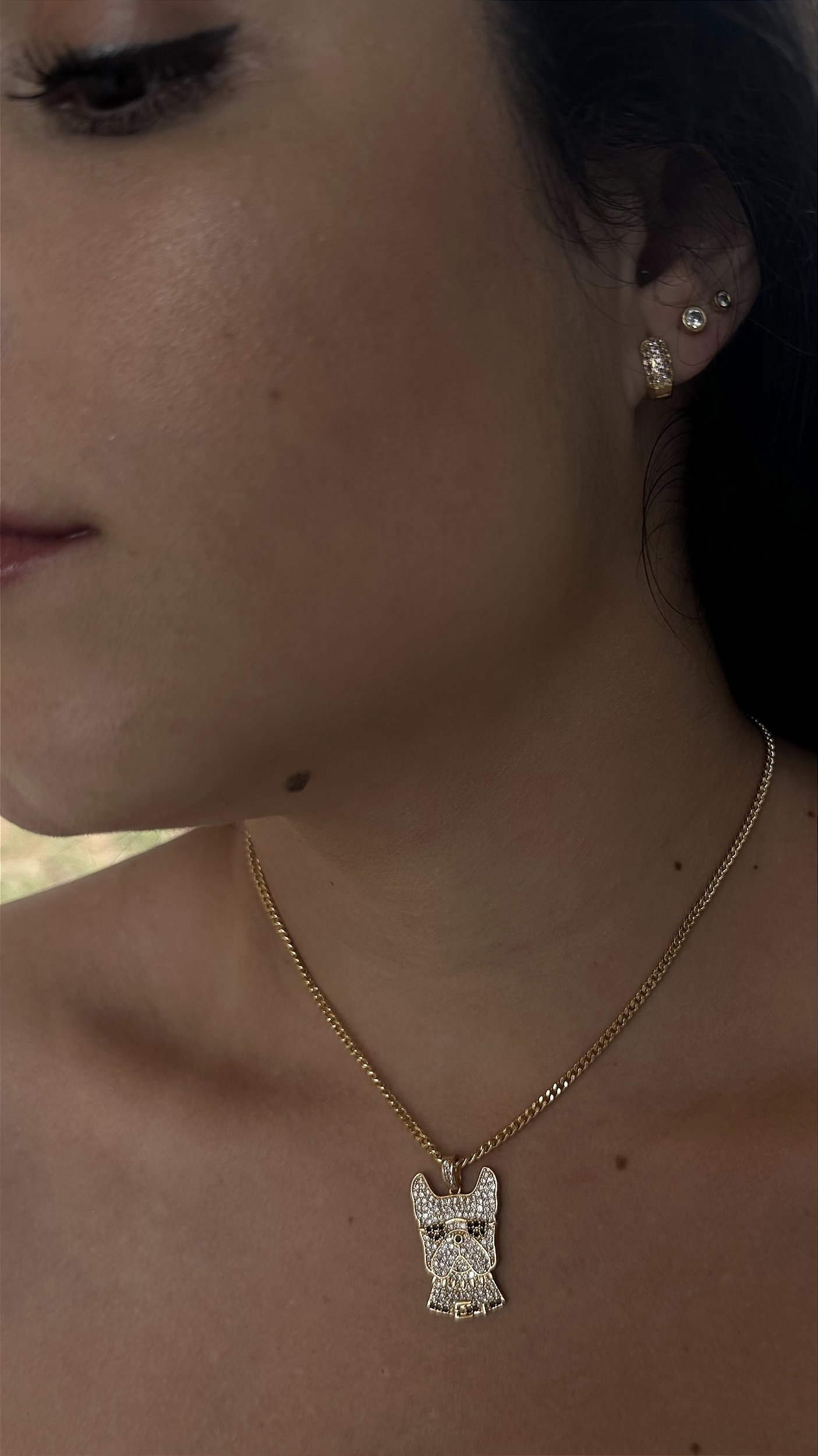 Colar corrente mini elos grume e pingente cachorro bulldog cravejado por zirconias.