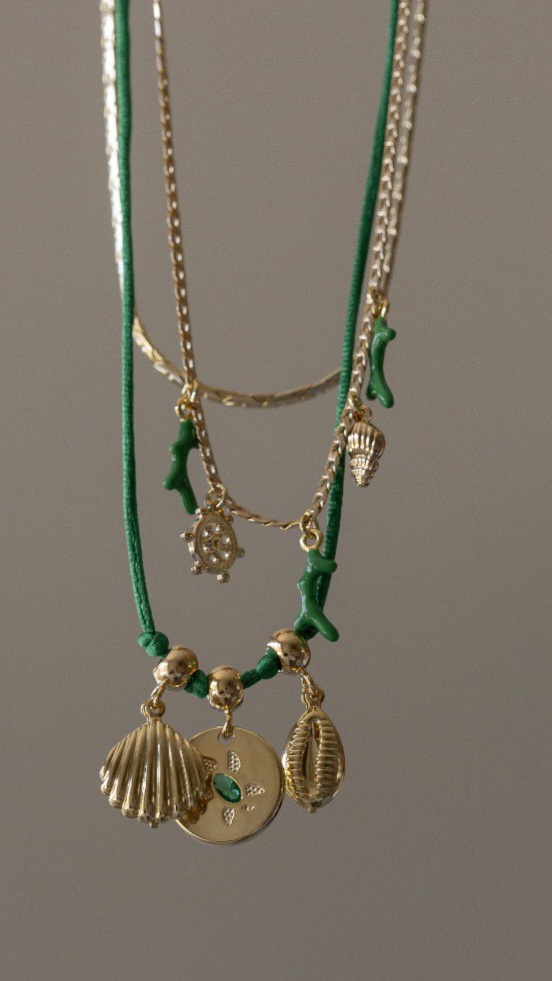 3 pingentes de algas esmaltados de verde, um pingente de leme e um de concha intercalados.