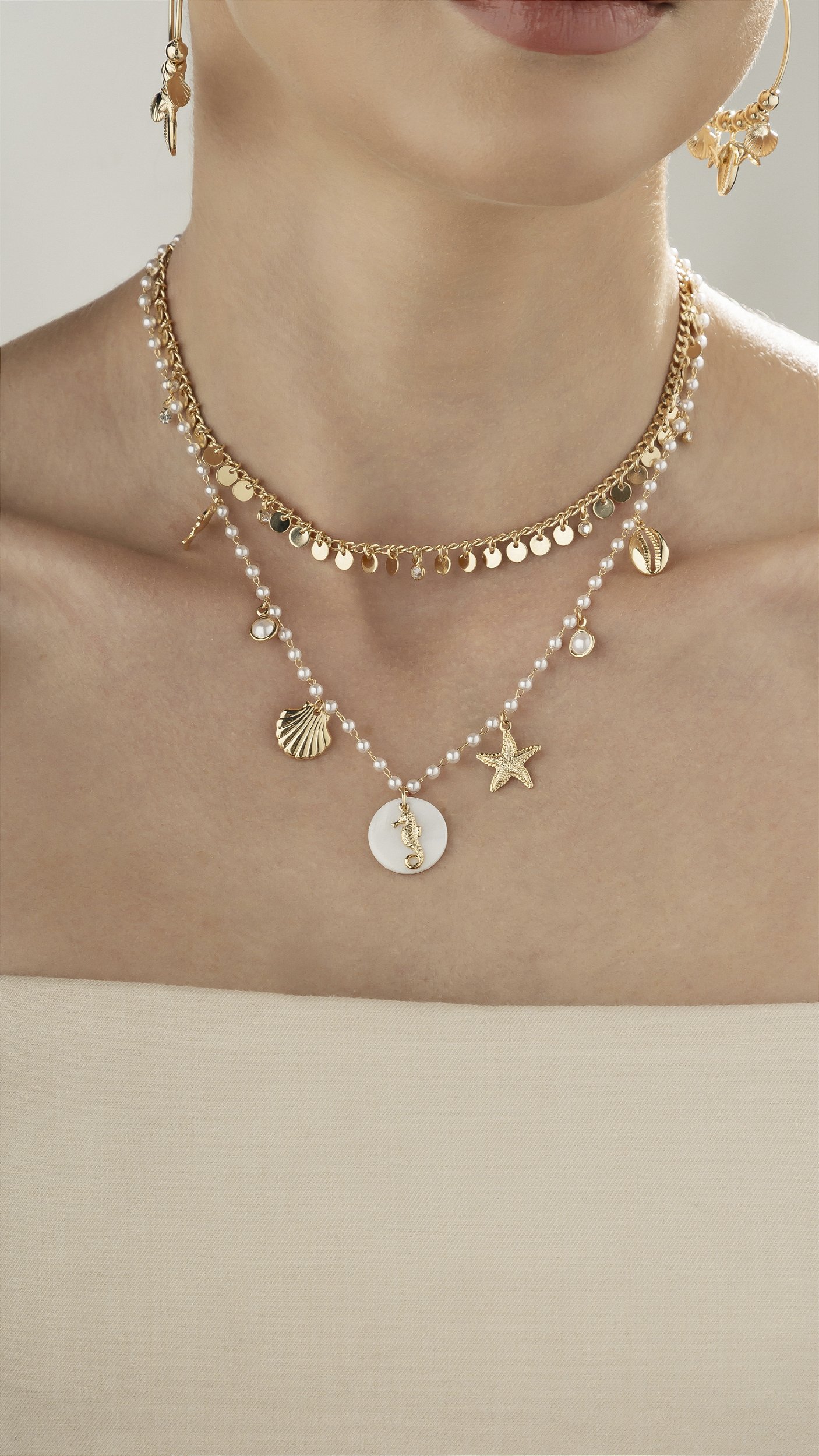 Colar corrente de perolinhas sintéticas e pingentes com tema do mar.
