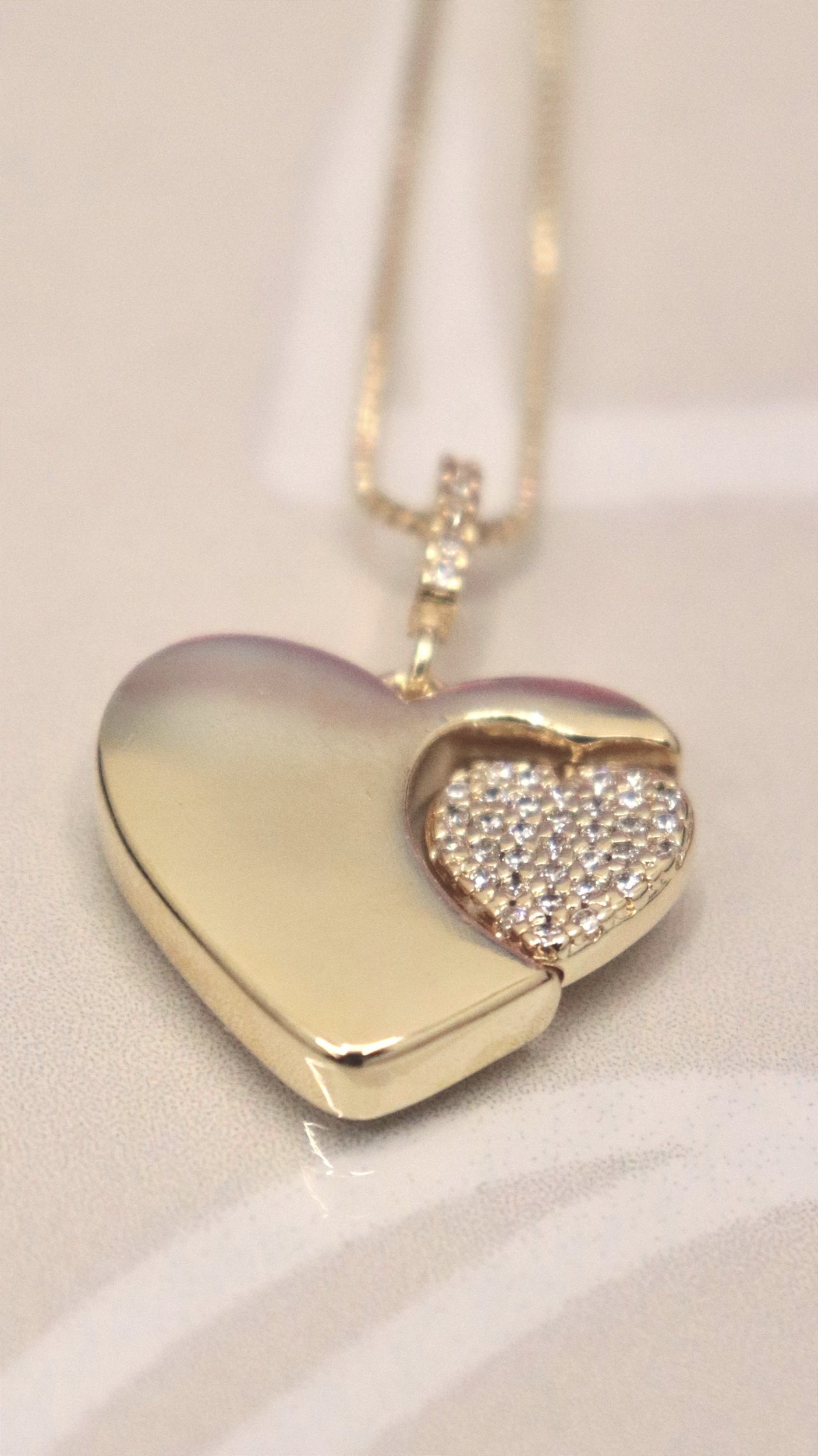 Pingente de coraração liso com encaixe de outro coração cravejado com giro de 360º.