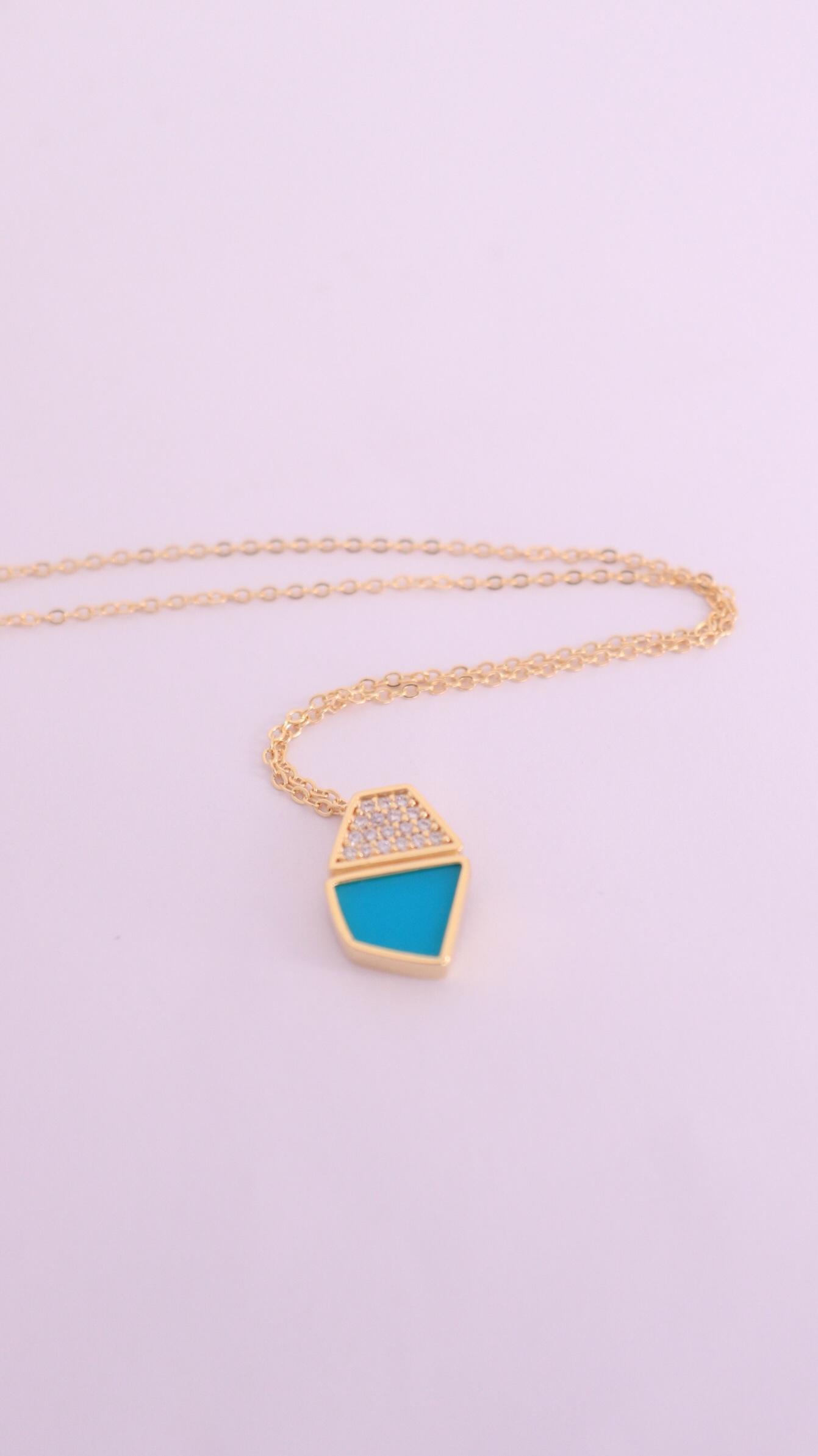 Pingente com 1,8cm, geométrico com rensina turquesa e cravação de zircônias cristais.