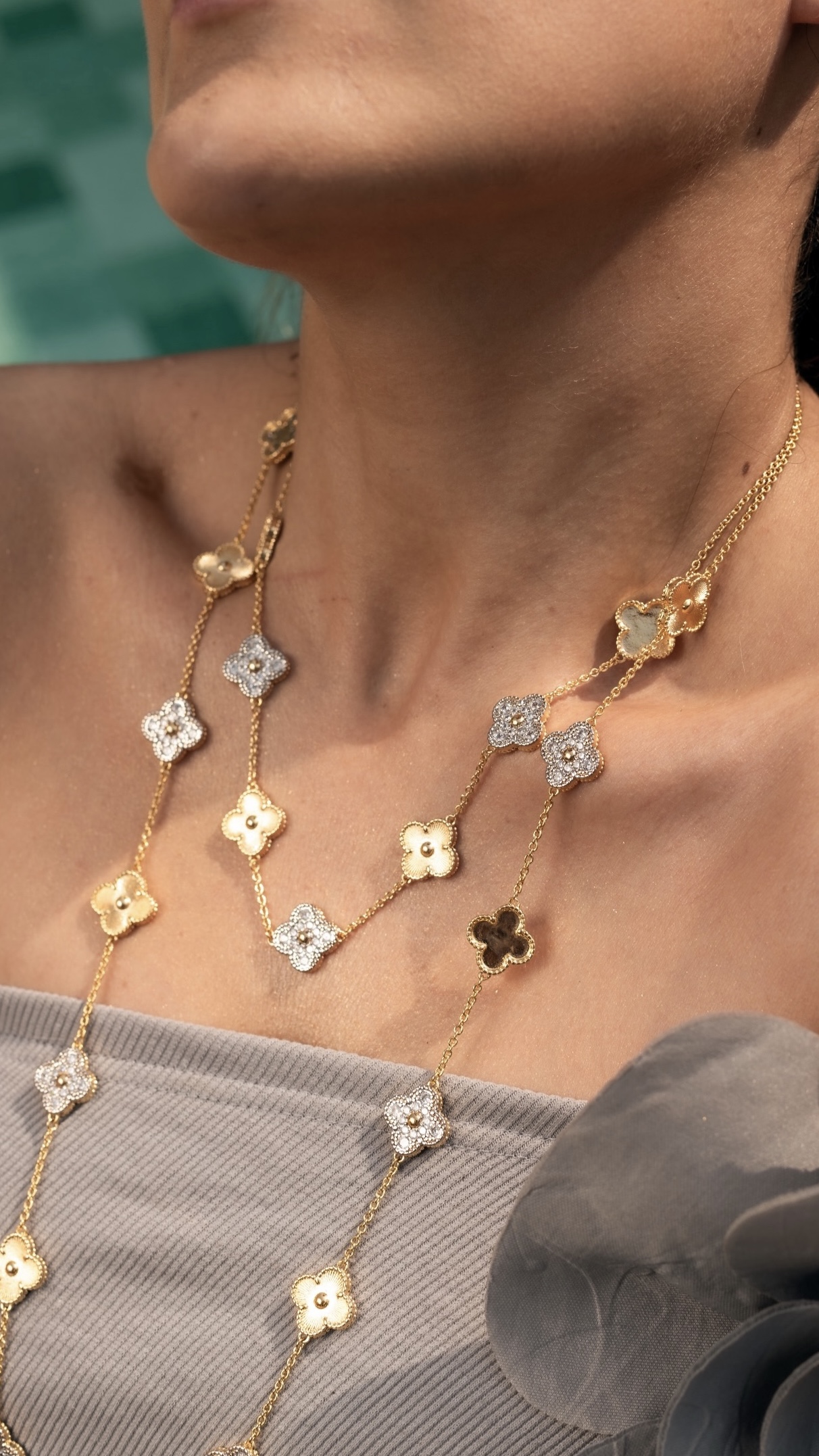 Colar curto inspiração Van Cleef de trevos canetado de rodio branco com zirconias e de ouro liso.