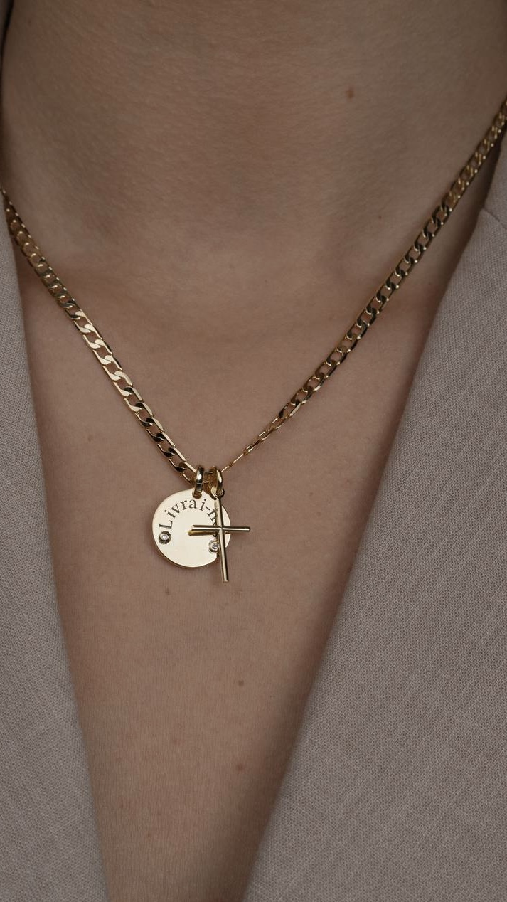 Colar de elos com pingente de cruz e placa redonda escrito " livrai-nos "