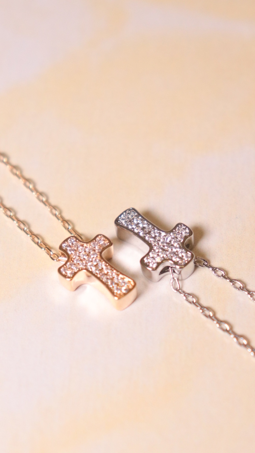 Pingente de cruz cravejada por zircônias cristais com 1,3 cm.