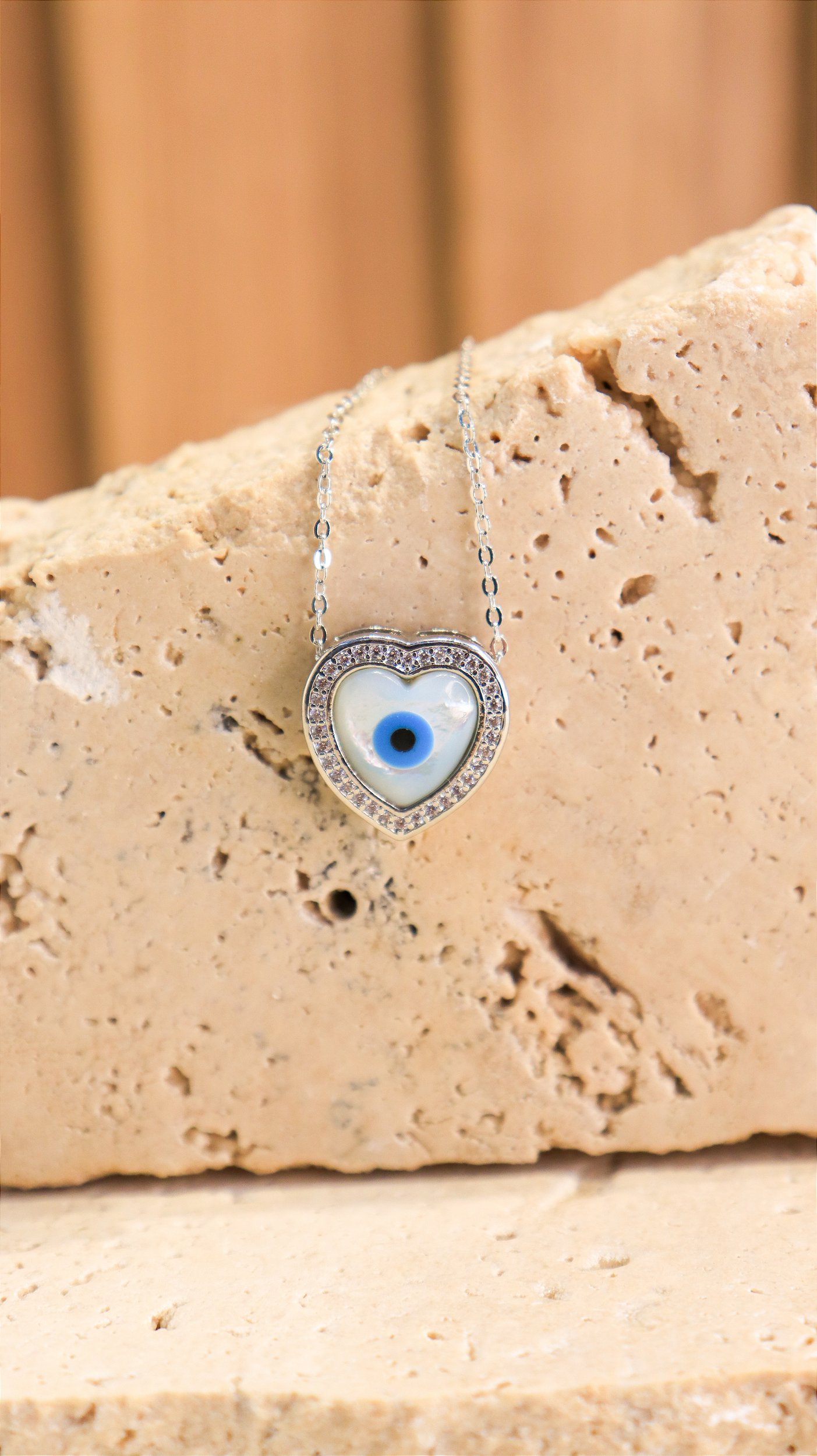 Pingente em formato de coração com olho grego na madre pérola com borda craejada de zircônias.