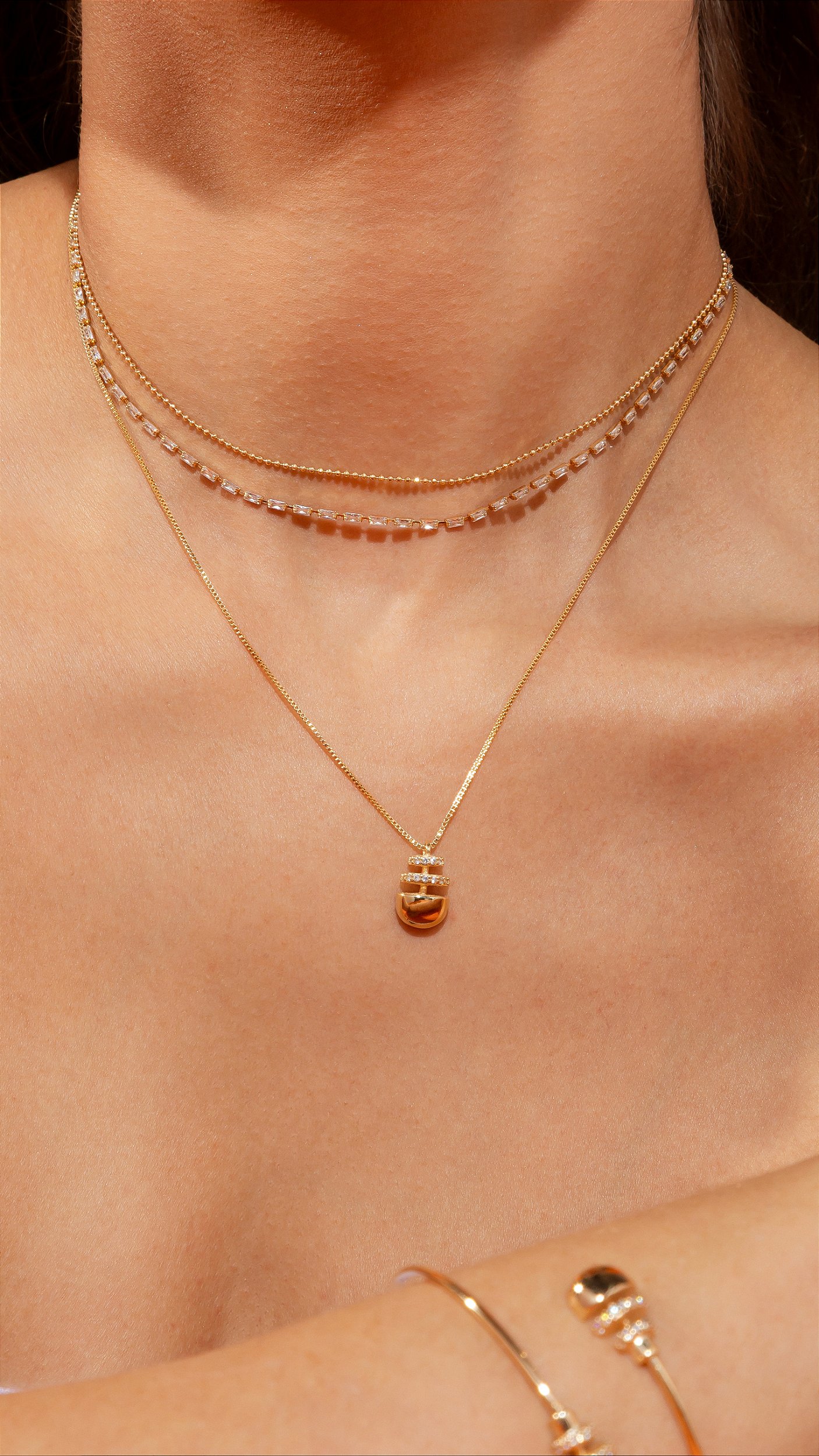 Colar corrente veneziana com 40cm de comprimento + 5cm de extensor e pingente linha dupla cravejado e meia esfera lisa de 1,5 cm.