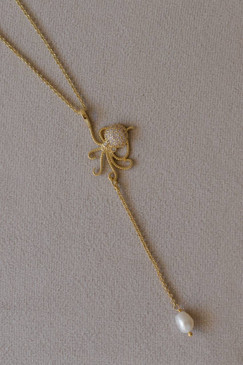 Colar polvo com cabeça cravejada em micro zircônias e detalhe de pérola barroca.