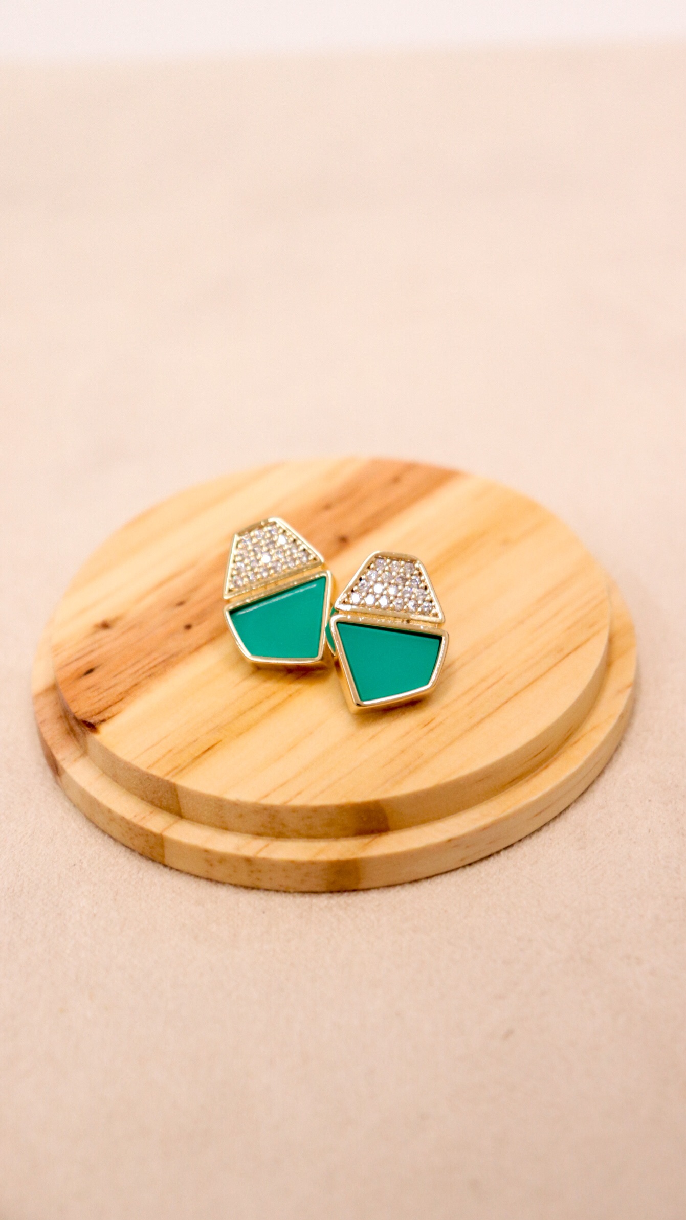 Brinco geométrico com rensina turquesa e cravação de zircônias cristais.