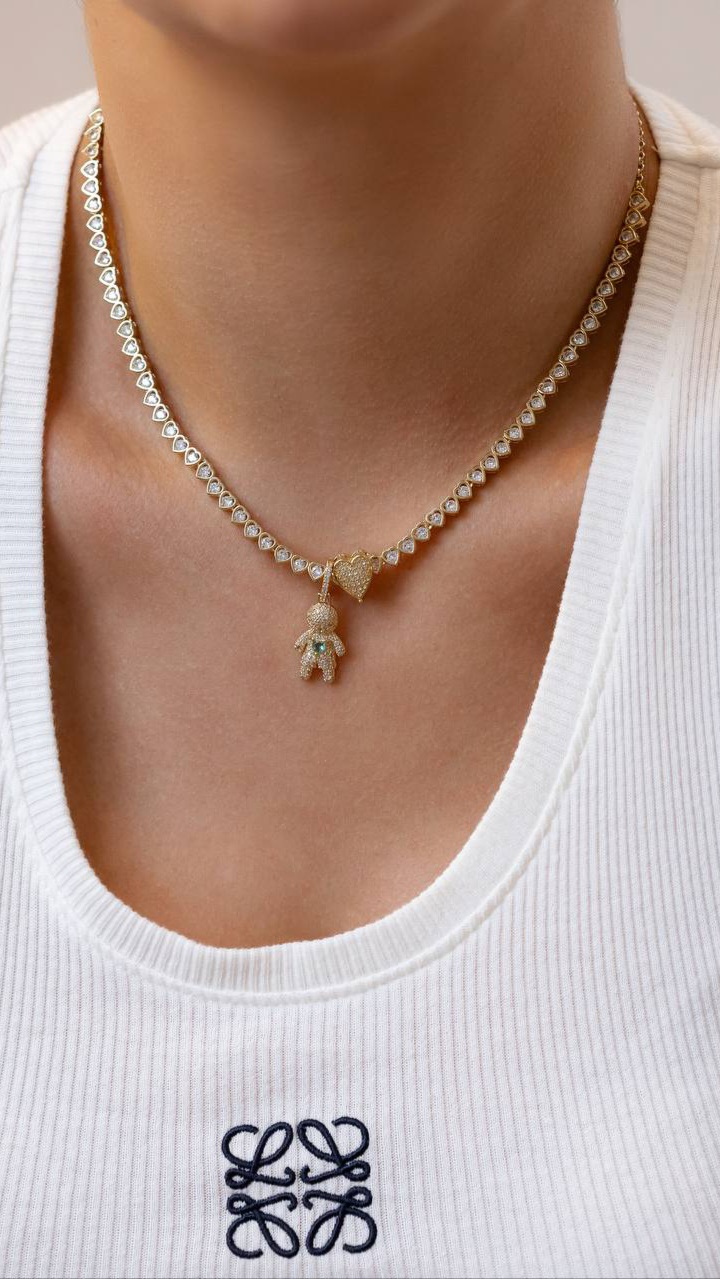 Pingente menina ou menino cravejado de zirconias cristais com corcação central de zirconia colorida.