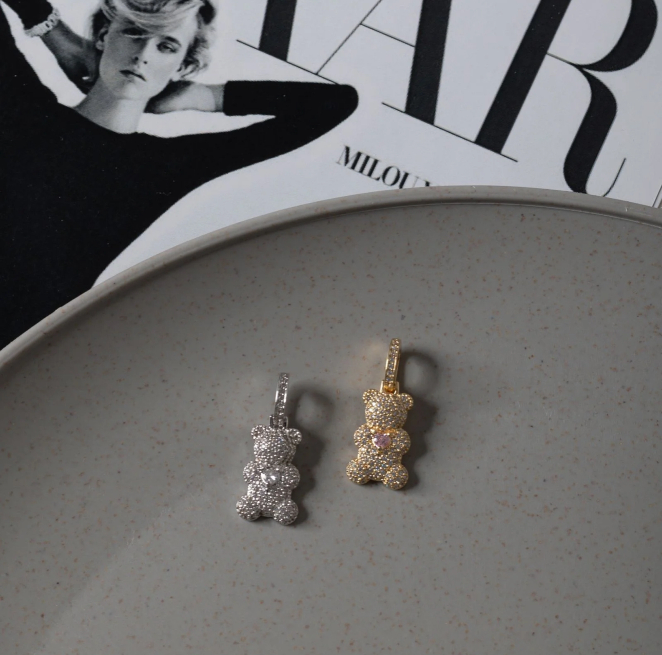 Pingente de urso banhado a ouro 18k ou a ródio branco cravejado de zirconias com corcação central de zirconia.